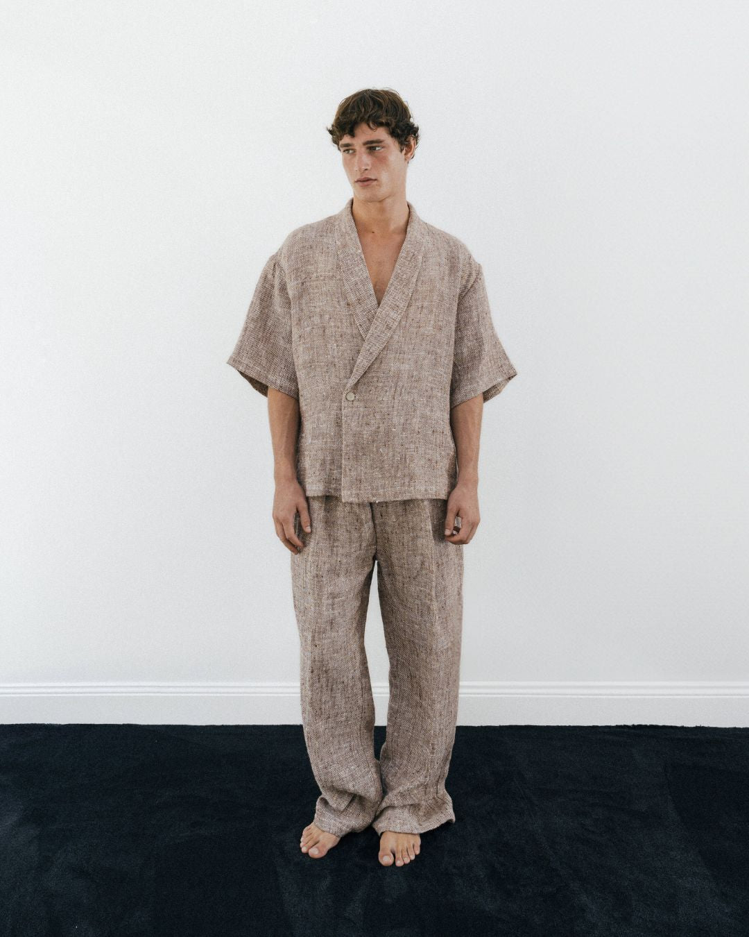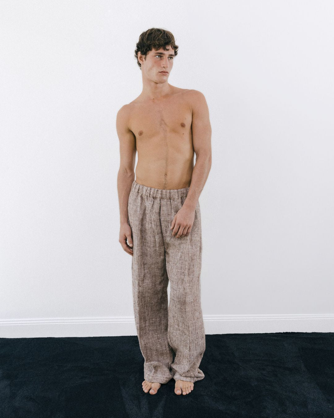 Generously wide-legged trousers featuring an elasticated waistband, crafted from weighty hand-loomed linen for exceptional volume and drape. Perfect for casual wear with a T-shirt or as part of the full suit for chic and relaxed summer events. Find the matching jacket here.